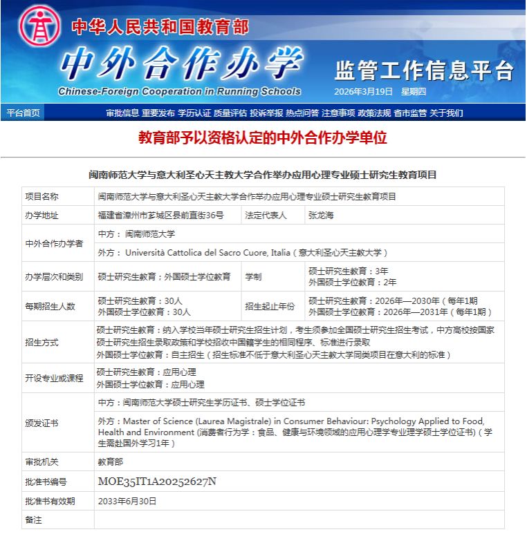 闽南师范大学与意大利圣心大学合作举办应用心理专业硕士研究生(Master of Applied Psychology, MAP)教育项目,由闽南师范大学与意大利圣心大学共同合办,是经中华人民共和国教育部批准设立的中外合作办学项目(办学许可证编号:MOE35IT1A20252627N)。项目隶属于闽南师范大学,办学地点设于闽南师范大学江滨校区。